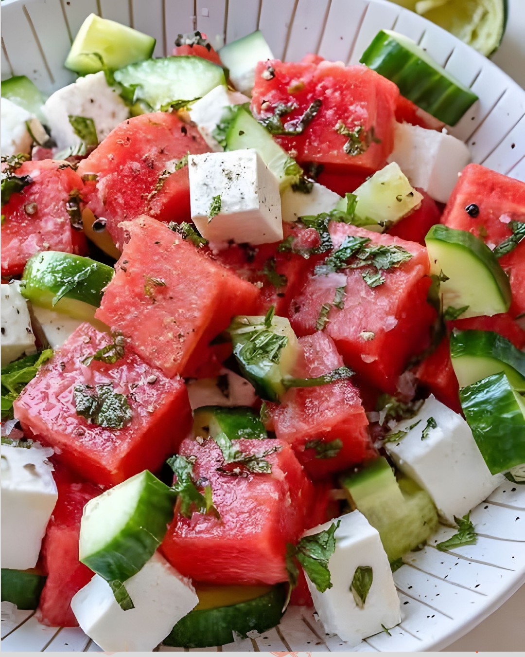 #WatermelonCucumberSalad #EasySummerRecipe #HealthySaladIdeas #FetaLovers #NoCookMeals #HydratingFoods #QuickSummerSalad #FreshFlavorBurst #MintAndLimeMagic