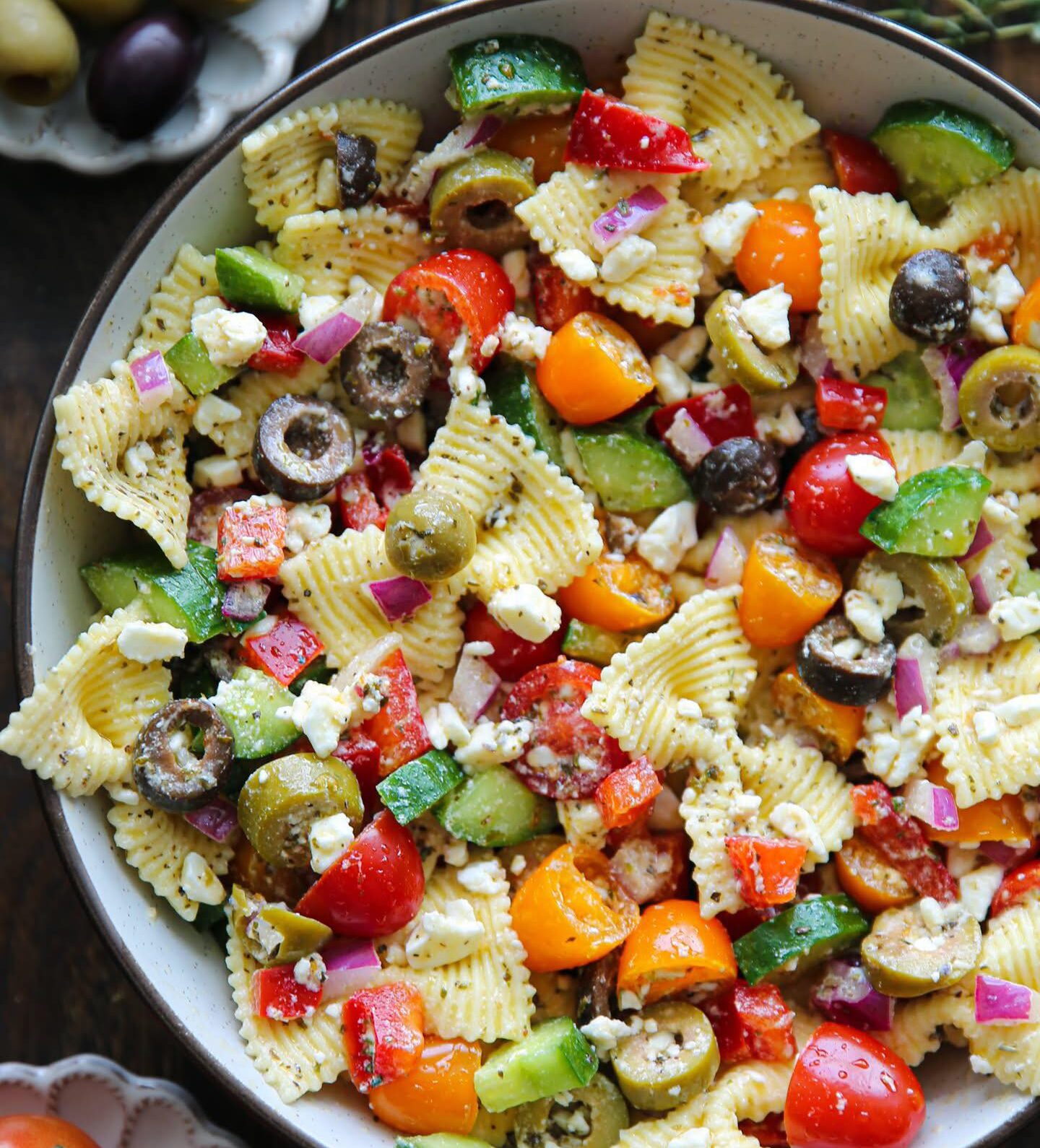 Greek pasta salad stands out because of its combination of fresh ingredients and bold flavors. The crunchy vegetables provide texture, while the olives and feta cheese add a savory and slightly salty taste.