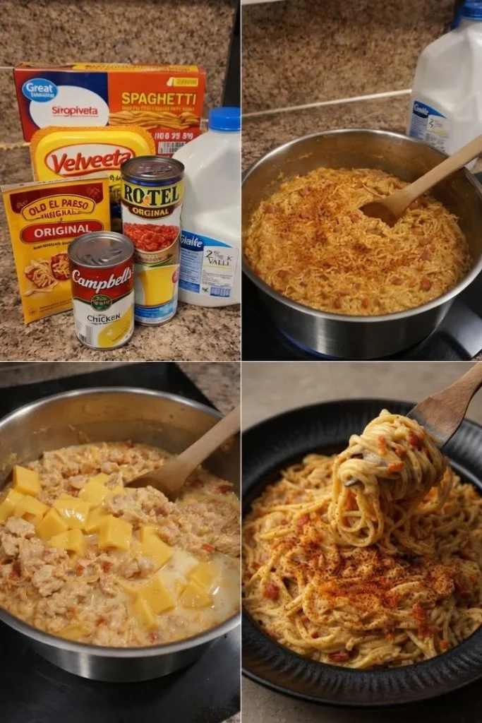 1. In a large pot, combine cooked spaghetti, cubed Velveeta cheese, and taco seasoning.