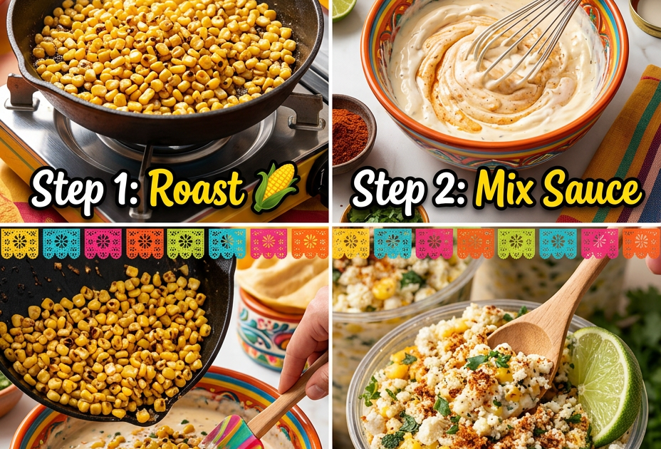 Start by heating the corn in a skillet over medium heat. Cook for about 5–7 minutes until the corn is warm and slightly roasted, adding a light char for extra flavor.
