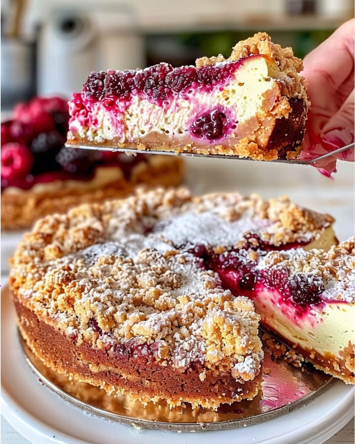 Dust lightly with powdered sugar, top with fresh berries, and serve chilled. Each bite will give you the perfect balance of creamy cheesecake, tangy fruit, and buttery crumble.